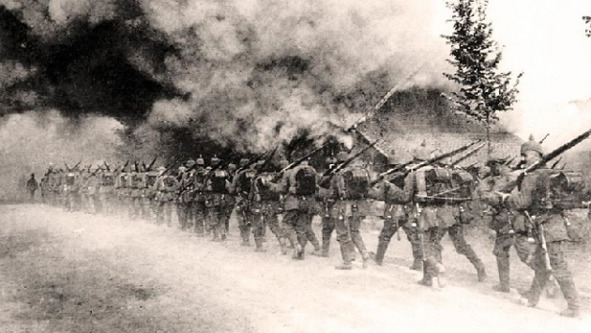German battalions advance in three lines 80—100 m apart. Scouts, assault groups and sappers are ahead, then dense groups of the actual, infantry, reinforced by flamethrowers, and machine-gun subunits. In one day, one can advance one to two kilometers in this way. Photography – German columns moving to the front line, Verdun, early 1916