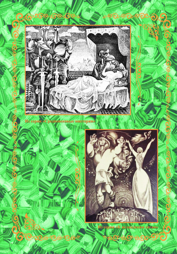 Здесь представлена серия «Средневековые мистерии». Это было ужасное и возвышенное время. С одной стороны, пытки, процессы над ведьмами, крестовые походы, чума, разбой. С другой стороны, рыцарский идеал одухотворенной любви, непреходящие сокровища поэзии и религии, светлые, окрыленные молитвы святых подвижников. И Виталий Михайлович нашел символы, которые адекватно отражают то время: стреноженные лошади, мечи в ножнах, вспененные кубки с вином, шлемы и латы, обглоданные кости, длинноволосые красавицы. Создается тревожное и непередаваемое ощущение далекого, грозного, непростого времени, веющего и холодом, и обдающего адским жаром. И вместе с тем потрясающего, великого. Все зависит, какой дорогой шел человек. Как в песне: «Дьяволу служить или пророку, каждый выбирает по себе».