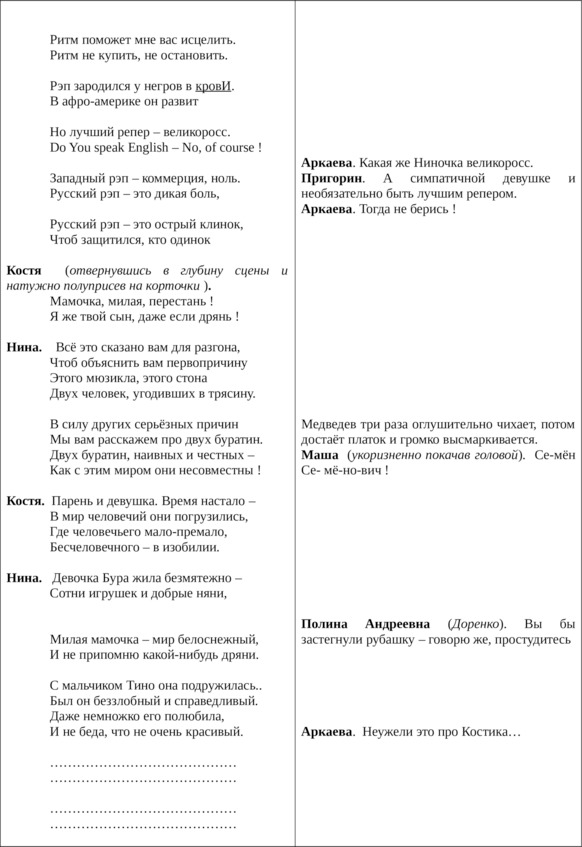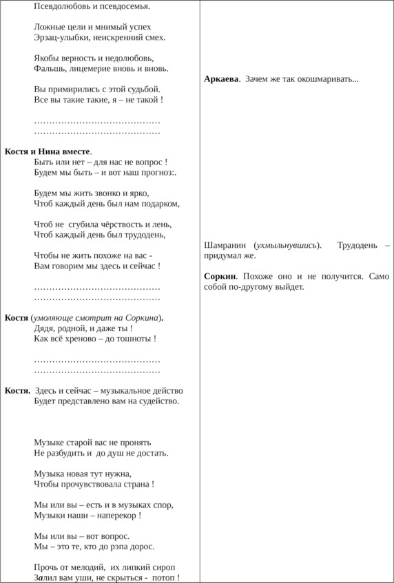 Аркаева. Дело не в терпении… Кто же знал, что для него это так серьёзно. Я думала, что он всё это придумал… так, развлечения ради. Типа «дачный спектакль» – не более. А он-то, оказывается, хотел явить миру новое мировоззрение. Так хотя бы предупредил! Да и нет ничего нового в этом его рэпе.