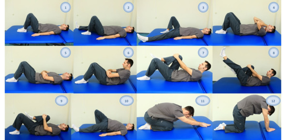 Рис. 17. Упражнение лечебной физкультуры, используется стол для Войта-Бобат терапии: 1. Исходное положение «лежа на спине», руки вдоль туловища, ноги согнуты в коленных суставах; 2—12. Показаны смены позиций комплекса упражнений, выполняется 5 повторов всего комплекса.