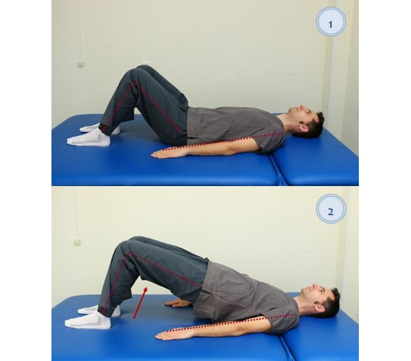 Рис. 19. Упражнение лечебной физкультуры, используется стол для Войта-Бобат терапии: 1. Исходное положение «лежа на спине», руки вдоль туловища, ноги согнуты в коленных суставах; 2. То же положение с поднятым тазом. Повторяем по 10—15 повторов.