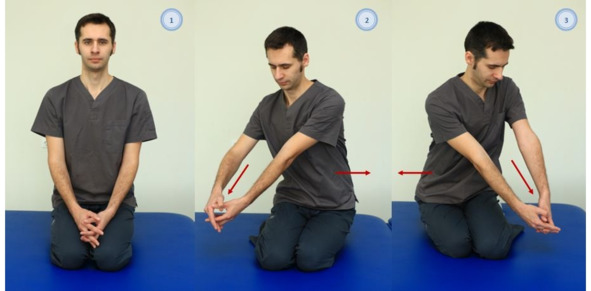 Рис. 21. Упражнение лечебной физкультуры, используется стол для Войта-Бобат терапии: 1. Исходное положение «сидя», ноги согнуты «под себя», руки лежат впереди, локти слегка согнуты, кисти сомкнуты; 2—3. Используем повороты таза влево и вправо с легким наклоном туловища вперед, руки выпрямляем вперед, оставляя сомкнутыми кисти. При повороте задерживаем положение на 5—10 сек. Повторяем 10 раз.