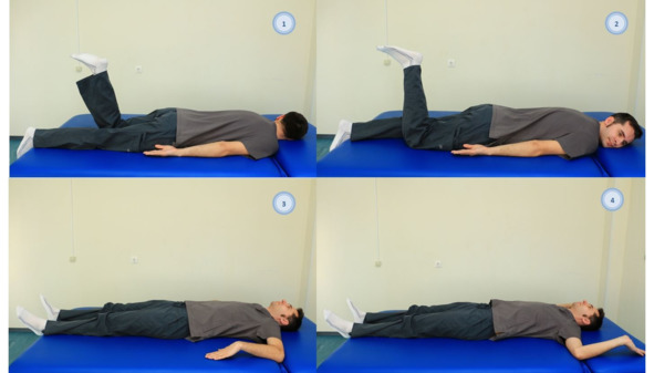Рис. 18. Упражнение лечебной физкультуры, используется стол для Войта-Бобат терапии: 1. Исходное положение «лежа на спине», руки вдоль туловища; 2. То же положение с согнутой в коленном суставе и поднятой правой ногой, задерживаем положение 5—10 сек. Поочередно выполняем для левой и правой ноги по 10—15 повторов.