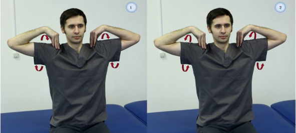 – В исходном положении сидя или стоя производите круговые движения плечами (плечо движется вверх, назад, вниз и вперед). Выполняйте вместе или поочередно каждым плечом по 5 раз. Затем повторите круговые движения в противоположную сторону (вниз, вперед, вверх, назад).