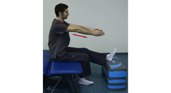 Рис. 24. Упражнение лечебной физкультуры, используется стол для Войта-Бобат терапии, степ-платформа: исходное положение «сидя», левая нога выпрямлена с опорой на степ-платформу, правая нога согнута в коленном суставе с опорой о пол, руки выпрямлены вперед, корпус слегка наклоняем вперед, задерживая положение на 10—15 сек, повторяем для правой и левой ноги поочередно 5—10 раз.