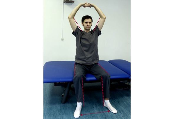 Рис. 25. Упражнение лечебной физкультуры, используется стол для Войта-Бобат терапии: используем статичное положение «сидя», руки подняты над головой ладонями вверх, кисти сомкнуты вместе, руки слегка согнуты в локтях, ноги согнуты в коленных суставах, стопы слегка развернуты кнаружи. Удерживаем положение 10—15 сек. Выполняем 10 повторов.