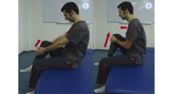 Рис. 16. Упражнение лечебной физкультуры, используется стол для Войта-Бобат терапии: 1. Исходное положение «сидя», руки выпрямлены отведены за спину, ноги согнуты в коленных суставах, стопы слегка развернуты кнаружи; 2. То же положение, но руки согнуты в локтях, задерживаем положение на 10 сек; 3. Руки выпрямлены вперед, ноги согнуты в коленных суставах, стопы слегка развернуты кнаружи. Тянемся корпусом вперед, оставляя спину прямой, задерживаем положение на 5—10 сек., возвращаясь в исходное. Выполняем 8—10 повторов.