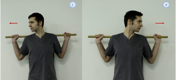 Рис. 29. Упражнение лечебной физкультуры, используется гимнастическая палка: 1—2. Исходное положение «стоя» или «сидя», в руках гимнастическая палка длиной 90—100 см. Гимнастическая палка опускается за спину, выполняются повороты головы поочередно в стороны с задержкой в положении на 10—15 сек. Вся комбинации повторяется 5—10 раз.