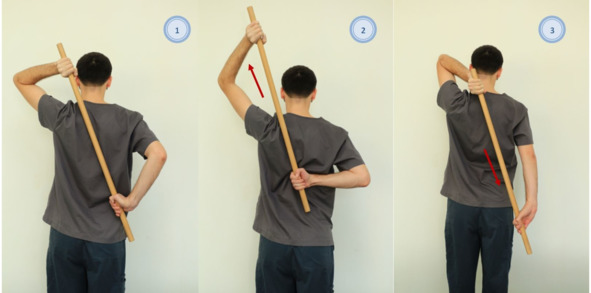 Рис. 30. Упражнение лечебной физкультуры, используется гимнастическая палка: 1. Исходное положение «стоя» или «сидя», руки согнуты в локтях и заведены за спину (левая руку сверху, правая снизу), в руках гимнастическая палка длиной 90—100 см.; 2—3. Гимнастическая палка поочередно поднимается вверх и опускается вниз с задержкой в положении на 10—15 сек. Вся комбинации повторяется 5—10 раз с изменением положения рук (левая руку сверху, правая снизу/правая руку сверху, левая снизу).
