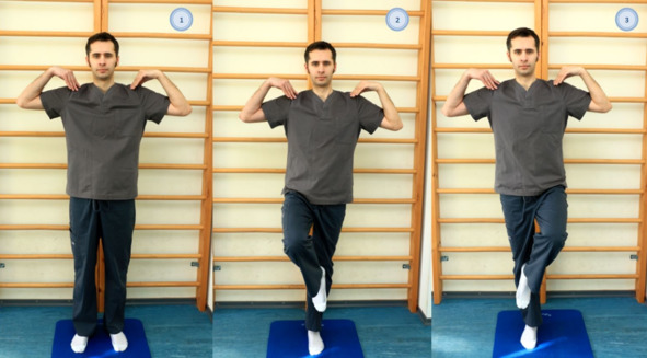 Рис. 31. Упражнение лечебной физкультуры: 1. Исходное положение «стоя», руки согнуты в локтях, кисти приведены к плечам; 2—3. Используем положение «стоя на одной ноге», удерживаем положение 5 сек., поочередно меняя опорную ногу повторяем упражнение 5—10 раз.