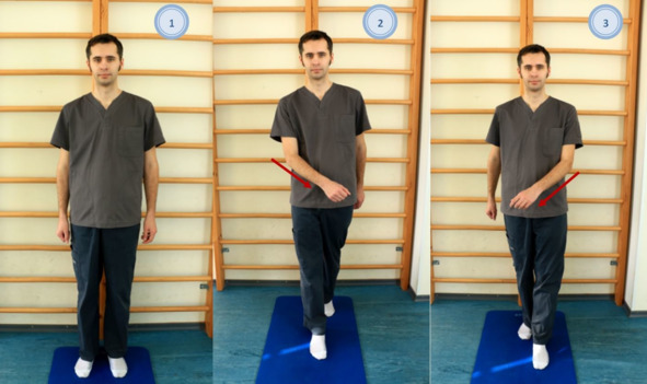 Рис. 32. Упражнение лечебной физкультуры по эргономике шага: 1. Исходное положение «стоя»; 2—3. Во время шага активно используем движения верхними конечностями.