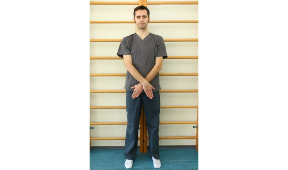 Рис. 33. Упражнение лечебной физкультуры: используется статичное положение «стоя», руки опущены вниз, слегка согнуты в локтевых суставах, перекрещены на уровне запястьев, ноги на ширине 20 см. Удерживаем положение 30—60 сек.