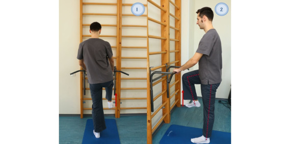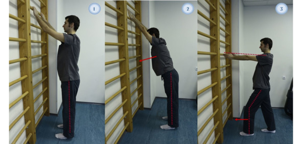 Рис. 35. Упражнение лечебной физкультуры: 1. Исходное положение – «стоя» лицом у гимнастической стенки, ноги на ширине 20 см, поднимаем руки вверх, слегка согнув в локтях; 2. Выполняем наклоны корпуса вперед, задерживаем положение на 20 сек; 3. Стоя перед гимнастической стенкой на расстоянии вытянутой руки поочередно делаем вперед шаг левой и правой ногой, руки держим перед собой собой полностью выпрямив.