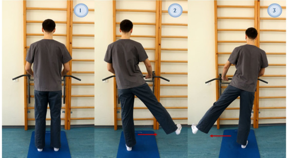 Рис. 36. Упражнение лечебной физкультуры: 1. Исходное положение – «стоя» лицом у гимнастической стенки, ноги на ширине 20 см; 2—3. Поочередно поднимаем прямые правую и левую ноги в стороны, задерживаясь в данном положении на 5—10 сек, повторяем для каждой ноги 8—10 раз.