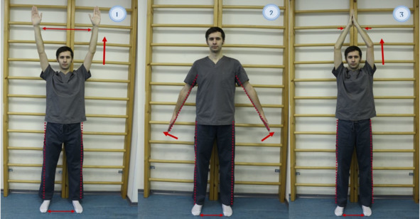 Рис. 38. Упражнение лечебной физкультуры: 1. Исходное положение – «стоя» спиной к гимнастической стенке, ноги на ширине 20 см, поднимаем руки вверх; 2. Опускаем руки вниз; 3. Поднимаем руки вверх слегка согнув локти и соприкасаясь ладонями. Выполняем 15—20 повторов.