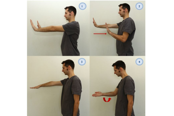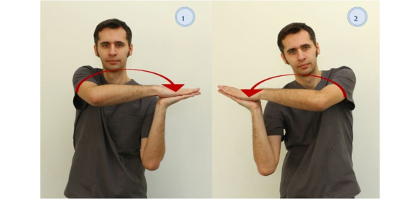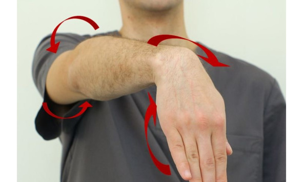 Рис. 39. Упражнение лечебной физкультуры: исходное положение «стоя» или «сидя» с вытянутой вперед рукой – выполняем круговые вращения в плечевом суставе и в кисти поочередно по часовой стрелке и против по 5 раз в каждом направлении. Выполняем поочередно для левой и правой руки.