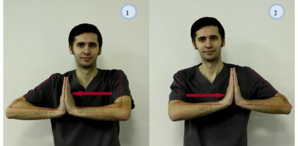 Рис. 41. Упражнение лечебной физкультуры: исходное положение «стоя» или «сидя», ладони сложите вместе, предплечья параллельны полу; 1—2. Перемещайте ладони в одну сторону до предела и в другую, как показано на рисунке. Повторить 8—10 раз в каждую сторону.