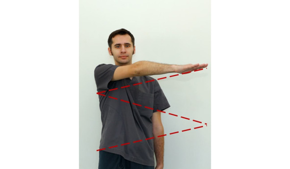 Рис. 42. Упражнение лечебной физкультуры: исходное положение «стоя» или «сидя». Правая рука на уровне лица со стороны. Выпрямленной правой рукой рисуем зигзаг, проводя линии под углом. Повторить 8—10 раз для каждой руки.