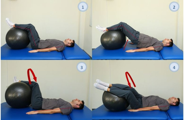 Рис. 44. Упражнение лечебной физкультуры, используется стол для Войта-Бобат терапии, фитбол: 1. Исходное положение «лежа на спине», ноги согнуты в коленных суставах с опорой на фитбол; 2. Выполняется подъем таза; 3—4. Возвращаемся в исходное положение и выполняем повороты тазом влево и вправо. Выполняем весь комплекс 5—10 раз.