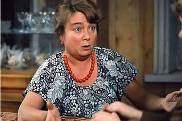 Из этого фильма Надюха: причапуренная по случаю выхода в магазин, в чёрных рейтузах и белых носках (в босоножках!). Со своим «Людк, а Людк!» – это вообще колхоз в квадрате, колхоз в кубе, колхоз колхозлятинский!