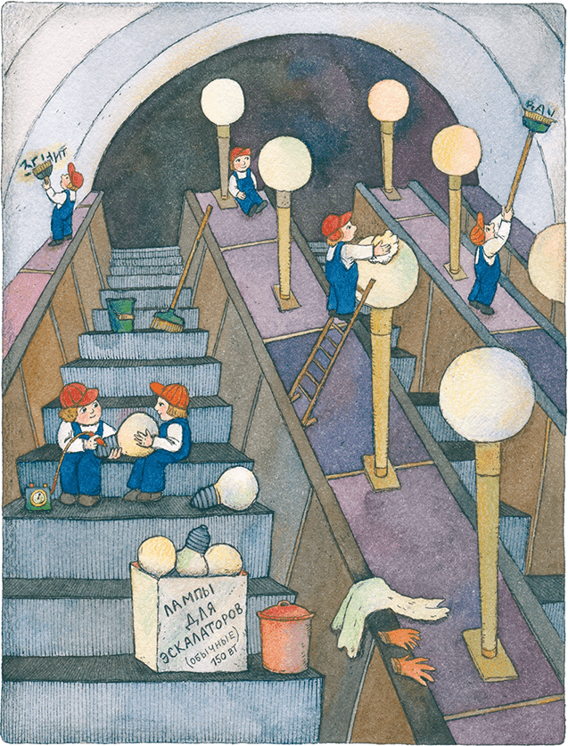 В ночном мраке станции мигнёт один огонёк, другой, третий. И скоро вся станция озарится светом маленьких фонариков. Фонарики держат крохотные человечки, которые по одному выбираются из темных туннелей и расходятся по станции. На человечках синие рабочие комбинезоны, часто перепачканные машинным маслом. У каждого, кроме фонарика, есть ящичек с инструментами. Эти человечки начинают всё чистить и наводить порядок вокруг. Где-то натянут кабель потуже, где-то починят ступени эскалатора, где-то перегоревшую лампочку заменят.