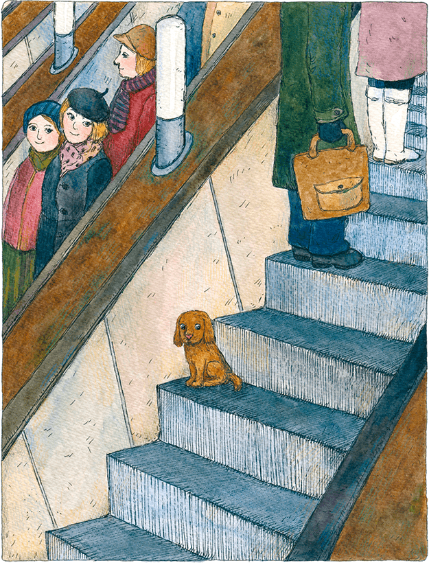 Так доехал Юнька до самого верха, проскочил между турникетами и оказался перед очень большими дверями. Стало Юньке страшновато. Но тут старичок идёт. Открыл дверь перед щенком и говорит ласковым голосом: «Иди-иди, не бойся!»