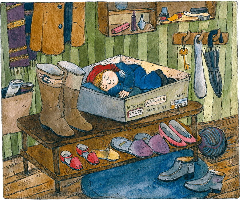 Юнька устал. Хотелось спать, да нельзя! Есть у метрольцев такая особенность: во время сна они опять превращаются из собак в самих себя – в метрольцев. Что делать? Глаза сами собой слипаются. Спасла его бабушка. Вышла из кухни и отправила девочку в ванную мыть руки перед ужином. Только девочка ушла, Юнька залез на полку с обувью, забрался в коробку с ботинками да там и заснул.
