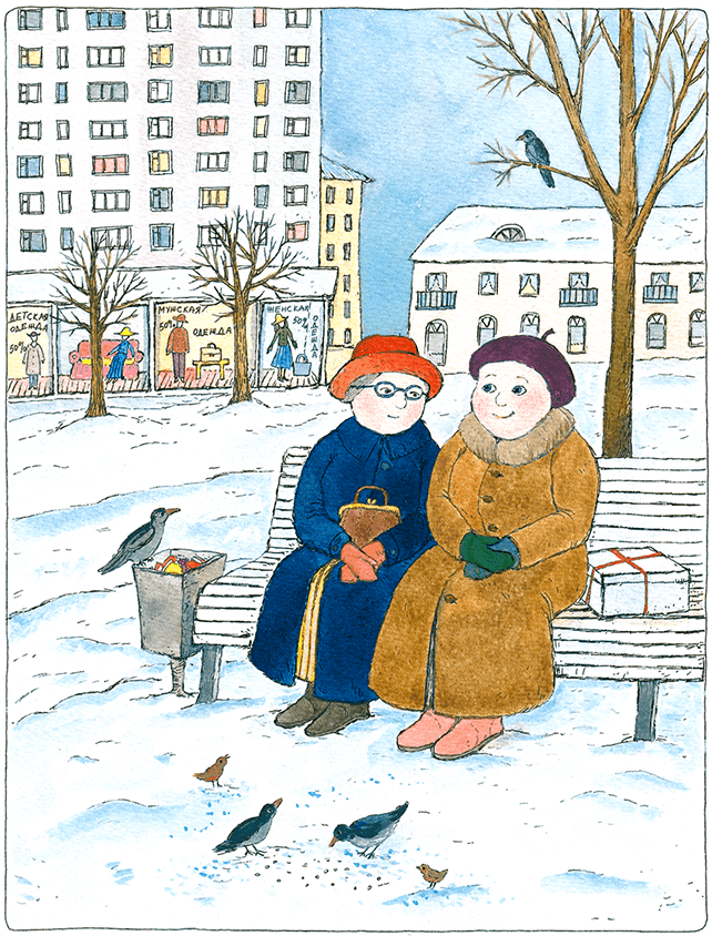 Юнька, умаявшись от приключений, спал в обувной коробке. И пока он там крепко спал, бабушка взяла эту коробку, перевязала красивой ленточкой и пошла на встречу со своей подругой – они договорились увидеться в сквере у выхода из метро.