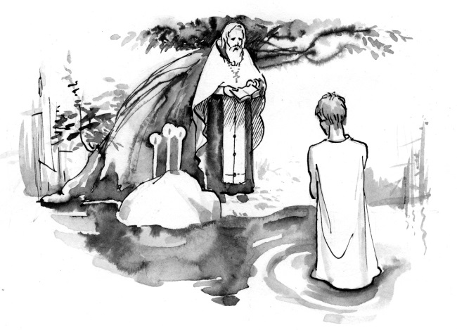 На рассвете, когда еще в Горках и петухи не пели, а в баньке, положив под голову кочан капусты, сладко спал деревенский «петух» дядя Егор, мы спустились по косогору к реке. Вода в реке была тихая, и над ней стоял молочный туман, было слышно, как плескалась крупная рыба и в прибрежных кустах крякали утки. Батюшка Алексий, в темном подряснике, в поручах и епитрахили, выбрал удобное место, зажег и поставил на камни три свечи. Вначале по требнику он читал молитвы и опускал целовальный крест в воду, чтобы отогнать бесов, тайно собравшихся у берега, чтобы испакостить крещение, затем вопрошал меня, отрекаюсь ли я от сатаны и всех дел его. Я, конечно, тут же отрекся и трижды плюнул в сторону запада, где обитает проклятый враг Христов. Бабушка развязала узелок, аккуратно разложив крестильную рубаху, полотенце, поясок, положив сверху найденный именитый крест. Раздевшись, в чем мать родила, я ступил в теплую, парную воду реки. Под ногами хрустел песок и резвились веселые пескари. Что-то темное и большое медленно ушло в глубину. По команде батюшки трижды, с головою, «во имя Отца и Сына и Святаго Духа» – погружался в воду. Когда я вышел из реки, бабушка обтерла меня грубым льняным полотенцем и отдала его батюшке. Я не сознавал, что со мной происходит и был как будто во сне. В глазах было синее небо, цветы и бабочки, порхающие вокруг меня. Батюшка, взяв крест и взвесив его на ладони, сказал, что он тяжеловат и немного велик для такого мальчишки, как я, но за неимением другого благословил носить его во спасение души и в жизнь вечную, тем более, что сам Бог послал его мне во святом источнике.