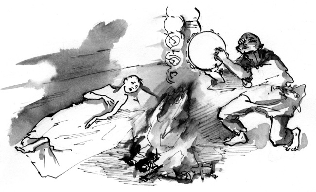 Войдя в избу, он дунул на все четыре стороны, приказал бабке повернуть лицом к стене икону, а затем осмотрел меня, ощупал мне шею, живот и ляжки. Из-под лохмотьев он вынул три коровьих рога: белый, черный и пестрый. Из каждого рога он доставал густую пахучую мазь и корявыми пальцами втирал ее мне в кожу. Затем из плоской старинной зеленого стекла фляжки налил мне жгучей коричневой жидкости и велел выпить. Все загорелось у меня внутри, сразу оставила слабость, и необъяснимое буйное веселье охватило все мое существо. На войлочной кошме меня вынесли во двор и положили на землю у костра. Шаман в медном котелке заварил на огне какие-то травы, грибы и коренья, остудил и разом выпил. После чего сел на землю лицом к костру, возложил на себя полосатый плат со священным знаком «Тамга» и тонким старческим фальцетом запел песню белого оленя, который гуляет в стране Шамбала, стране всеобщего благодействия. Темп пения все ускорялся, звук усиливался переходя в визг и где-то из подполья ему вторила, подвывая, запертая собака. Внезапно шаман встал, выпрямился и дробно застучал в бубен. Стуча и подпрыгивая, он стал медленно ходить вокруг костра, носком сапога очерчивая круг, в котором оказался и я. Наконец, он завыл полярным волком и, стуча в бубен, пустился в пляс вокруг костра. Без устали он пел, кричал, кружился и подпрыгивал, и это шаманское камлание продолжалось не менее получаса. Затем бабушка принесла ему живого красного петуха, и шаман, ловко оторвав ему голову, окропил меня горячей кровью.