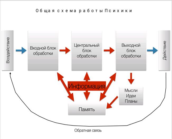 Внешние воздействия на Психику попадают в Блок обработки воздействий. Там образуется Информация, которая потом поступает в Блок обработки информации и в Память. В блоке обработки воздействий происходит не только преобразование в Информацию, но и первичная ее обработка с целью идентификации.