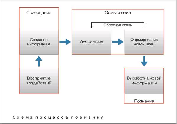 Работа философа состоит в созерцании и понимании окружающего мира. В результате совершается Познание. Созерцание есть не что иное, как восприятие входной информации из окружающего мира. Понимание есть обработка поступившей информации в Психике. Познание – результат обработки информации в виде мыслей, речи или текста, объясняющий смысл входной информации, то есть всего воспринятого. Оспорить сие утверждение весьма сложно, так как философ не производит ничего материального или энергетического. Только новую информацию, в том числе, о материи и энергии, о пространстве и времени. Поэтому несложно сделать логичное заключение: «Информация и есть результат Познания». В том или ином виде, но наша Психика производит только Информацию, и только потом, при помощи речи или письма, Информация перевоплощается в материальные формы. Но само Познание не возникает в речи или тексте, оно возникает в Психике и лишь, затем отображается в виде доступном для дальнейшей передачи.