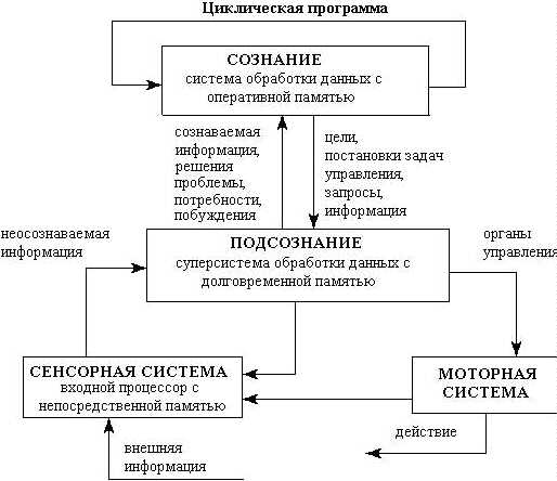 Такая схема очень наглядно отражает принципы работы нашей Психики. Но следует отметить, что в реальности схема гораздо сложнее. Если мы рассматриваем человека, как грандиозную управляемую систему, то этот рисунок лишь часть, отражающая лишь некоторые функции человеческой Психики. Но, путь начат, и он будет пройден. И добавлю еще цитату Сергина В.Я.