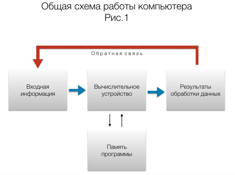 Без обратной связи мы имеем просто вычислительную систему или компьютер. Но структура то одинаковая для обеих систем. Именно эту блок-схему мы возьмем за основу для дальнейшего анализа.