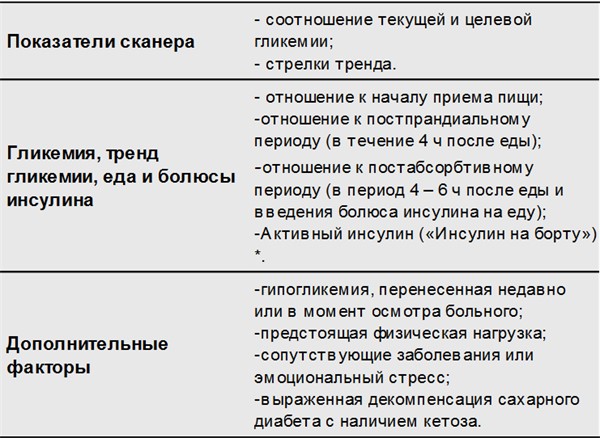 При расчете дозы инсулина учитывается целевой и текущий уровень гликемии, коэффициент чувствительности к инсулину (КЧИ), режим инсулинотерапии и питания больного, а теперь, на фоне флеш мониторирования, и тренд гликемии. (табл. 1.4.1.1.1).