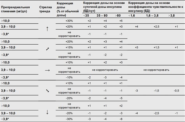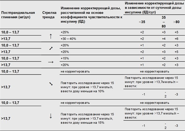 Таблица 1.4.1.3.1. Коррекция дозы постпрандиального инсулина на основе гликемии и стрелки тренда