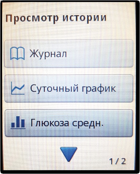 В сканере фактически представлен электронный дневник больного диабетом, который синхронизирован с показателями НМГ. Для его просмотра на сенсорном экране сканера следует нажать кнопку «Пуск» дважды, а затем нажать на появившийся на экране пункт «Просмотр истории» и выбрать необходимый отчет. (рис. 1.4.3.1.). Можно также вызвать на экран сканера и обобщающую информацию по сахароснижающей терапии за несколько дней, вплоть до максимального периода хранения данных на сканере – 90 дней.