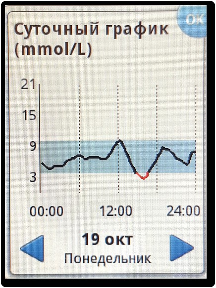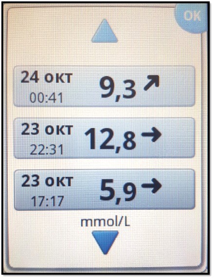 Доза болюса инсулина корректируется и в зависимости от направления стрелки (тренд вверх – доза увеличивается, так как гликемия растет, а при тренде вниз – уменьшается, так как гликемия снижается) и тем больше, чем направление стрелки круче [10].