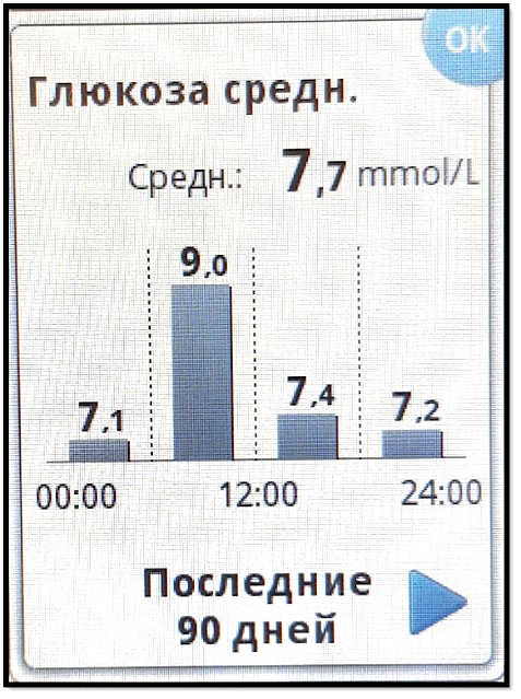 Информация о среднем значении глюкозы, измеренной сенсором. Среднее значение за определенный временной интервал времени отображается для 6- часовых периодов в течение дня (рис. 1.4.3.4.).