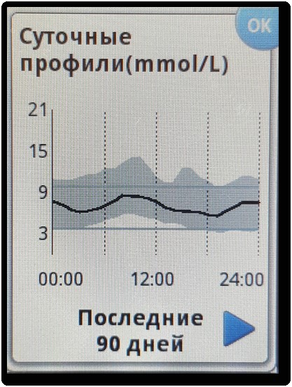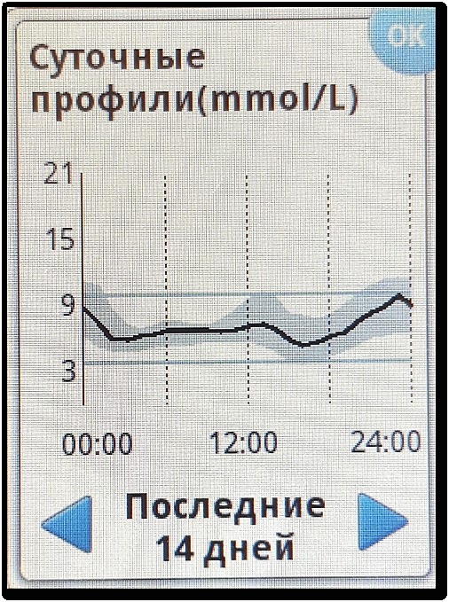 Суточные профили отображают динамику изменения уровня глюкозы в течение дня. Для построения данного графика требуется по меньшей мере 5 дней использования ФМГ (рис. 1.4.3.5.).