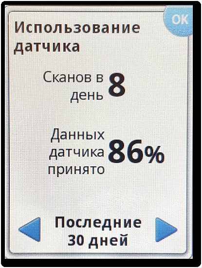 На экране сканера видна не только текущая гликемия, но и стрелка, которая отражает скорость и направление изменения гликемии (так называемый тренд гликемии). Это принципиально новая для больного информация, которой нет в глюкометре. И, вместе с тем, это очень важный показатель, который позволяет корректировать сахароснижающую терапию не только в зависимости от текущей гликемии, но и с учетом тренда гликемии [2].