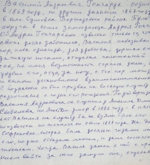 Мы знали, что это наш прадед, но фото я его не видел никогда. И папа часто рассказывал о Софроновне, потом мы узнали что Софроновна (Сафроновна) – это наша прабабушка. Андрей Гончаренко, мой прапрадед, был женат, к сожалению, имя жены не сохранилось, но у него было двое детей сын Василий и дочь.