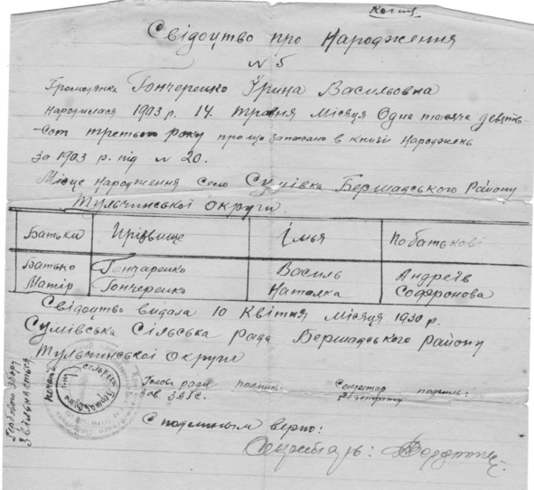 А в 1903 году 14 мая по старому стилю – 27 мая – по новому стилю родилась Ирина семимесячным ребёнком и выгрівала її Наталічка на печі в подушкáх тай викохала. Уже стала Ярынка (Ирина) говорить и ходить, как в одну такую же голодную зиму, терпя голод, Сафроновна сказала Ярынке: «Молись Богу, щоб дав нам хліба» и указала на угол, в котором находилась икона. Мать ушла, а доця стала просить хлеба, гладя на икону, а после просьбы заглядывала за икону – не выкатится ли оттуда хлебина? В те времена хлеб в печах пекли круглый. Тогда ещё маленькой девочкой только научившейся говорить, почти ничего не зная о Боге, она молилась, как могла, и Бог слышал её молитву. В раннем детстве жили Ирина с мамой и сестрой. Папа пил в Одессе. Через несколько времени открылись двери, Ярынка увидела маму – она несла в одной руке хлебину, а в другой полное ведро квашеной капусты! Это было спасение от Бога!