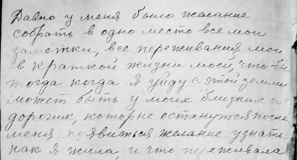 Это была тетрадь 96 листов, с чёрной или коричневой обложкой. На пожелтевших страницах был красивый бабушкин почерк. Это были короткие заметки, с чётким содержанием и точной датой события. На некоторых страницах строки текста были размыты. Только позже мне стало понятно, что это капли слез переживаний, под впечатлением которых она писала свои заметки. Прошли годы, и большое спасибо моему папе, что он переписал этот дневник, и это стало доступным для нас.