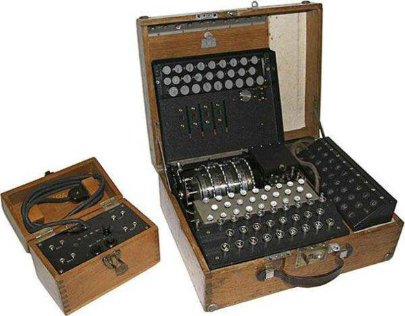 На снимке: «Энигма» (от нем. Änigma – загадка) – переносная шифровальная машина, использовавшаяся для шифрования и расшифрования секретных сообщений. Более точно, «Энигма» – целое семейство электромеханических роторных машин, применявшихся с 20-х годов XX века. Она использовалась Германией в годы Второй мировой войны, отличалась относительной простотой и массовостью использования: применить ее можно было практически везде – и в полевых условиях, и на подводной лодке. История Enigma берет начало в 1917 году, когда голландец Хьюго Коч получил на нее патент. Работа ее заключалась в замене одних букв другими за счёт вращающихся валиков.
