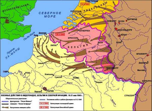 10 мая. Начало операции «Гельб» (или Французская кампания). Развернув войска у западной границы Германии, французы с 3 сентября 1939 г. до перехода вермахта в наступление 10 мая 1940 г. вели так называемую «странную войну». В этот отрезок времени боевые действия между немецкими и французскими войсками практически не велись. Они сводились к местным разведывательным операциям и артиллерийским перестрелкам, а также к акциям по разбрасыванию листовок. Это позволило Германии после разгрома Польши беспрепятственно подготовиться к наступлению с целью разгрома англо-французской коалиции. При этом фюрер не заручился помощью ни союзной Италии, ни партнера по Антикоминтерновскому пакту – Японии. Историки не сомневаются, что «странная война» объясняется выжидательной позицией союзников. И Великобритания, и Франция должны были понять, куда обратится Германская агрессия после захвата Польши. Не исключено, если бы вермахт после Польской кампании сразу начал вторжение в СССР, то союзники могли поддержать Гитлера.