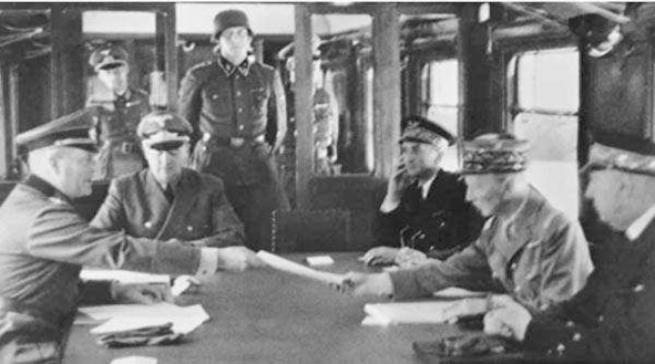 22 июня. Капитуляция Франции перед Германией. Знаменательно, что Гитлер, ненавидевший французов, приготовил им необычную месть за своё поражение в Первой мировой войне. Капитуляцию принимал лично фюрер, подписывал её с французской стороны генерал Шарль Хюнтцигер. Чтобы унизить проигравших, церемония специально была устроена там же, в Компьенском лесу и в том же железнодорожном вагоне, в котором 11 ноября 1918 года принимал капитуляцию от проигравшей Первую мировую войну Германии французский фельдмаршал Фердинанд Фош (см. снимок).