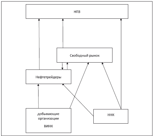 На представленной схеме (1) изображена структура договорных связей на внутреннем рынке нефти.