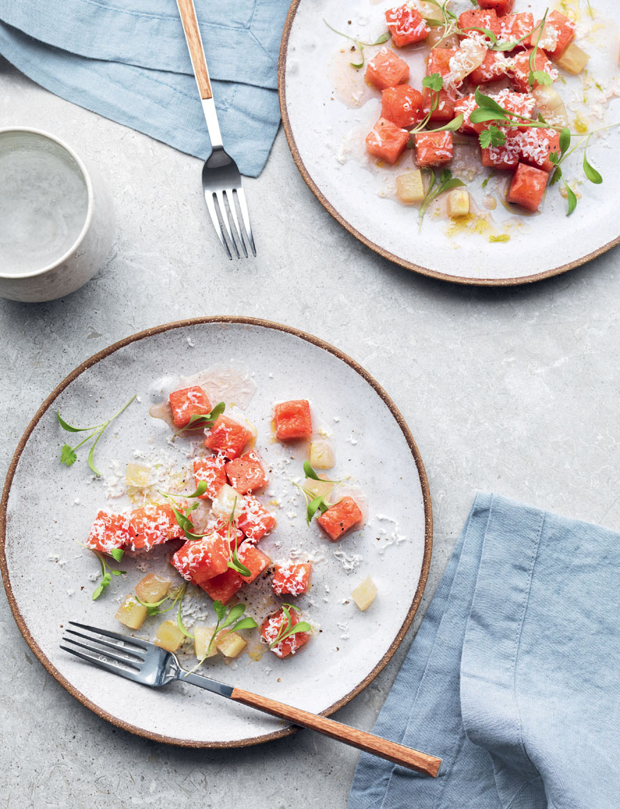 Apple and cheese is a classic combination, and my twist on a refreshing summer salad is to pair watermelon and savoury salted ricotta. Instead of discarding watermelon rind, try pickling it. It has a great texture and keeps for quite some time in the fridge. It works well as an accompaniment to most meat and fish, and in salads, like this one.