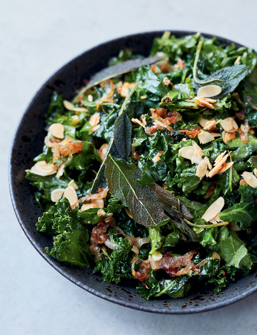 Thinly slice the remaining raw kale and mix it together in the bowl with the cooked kale, shallots, almonds and fried sage leaves. Season with more sea salt and loads of black pepper and drizzle with the dressing.